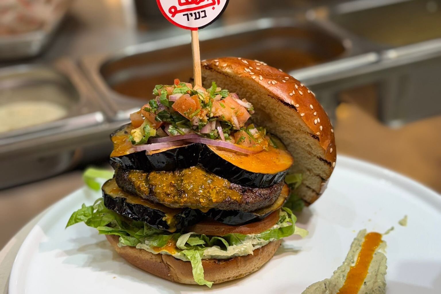 لحمه البرغر مع الباذنجان المقلي وصلصه الطحينه وخلطه المحل الخاصه
