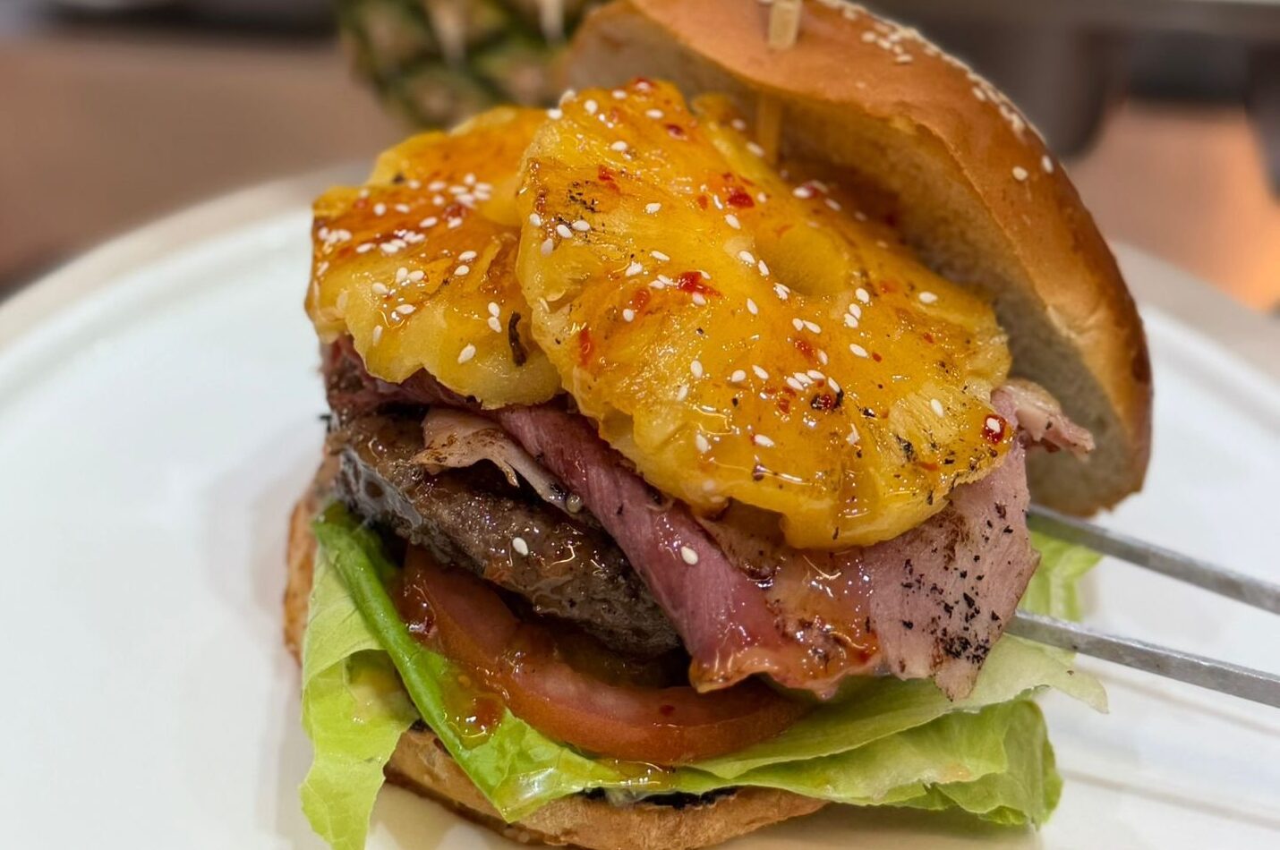 لحمه البرغر مع اضافه صدر الاوز وقطع الاناناس مع صلصه الحار حلو(تشيلي متوك)